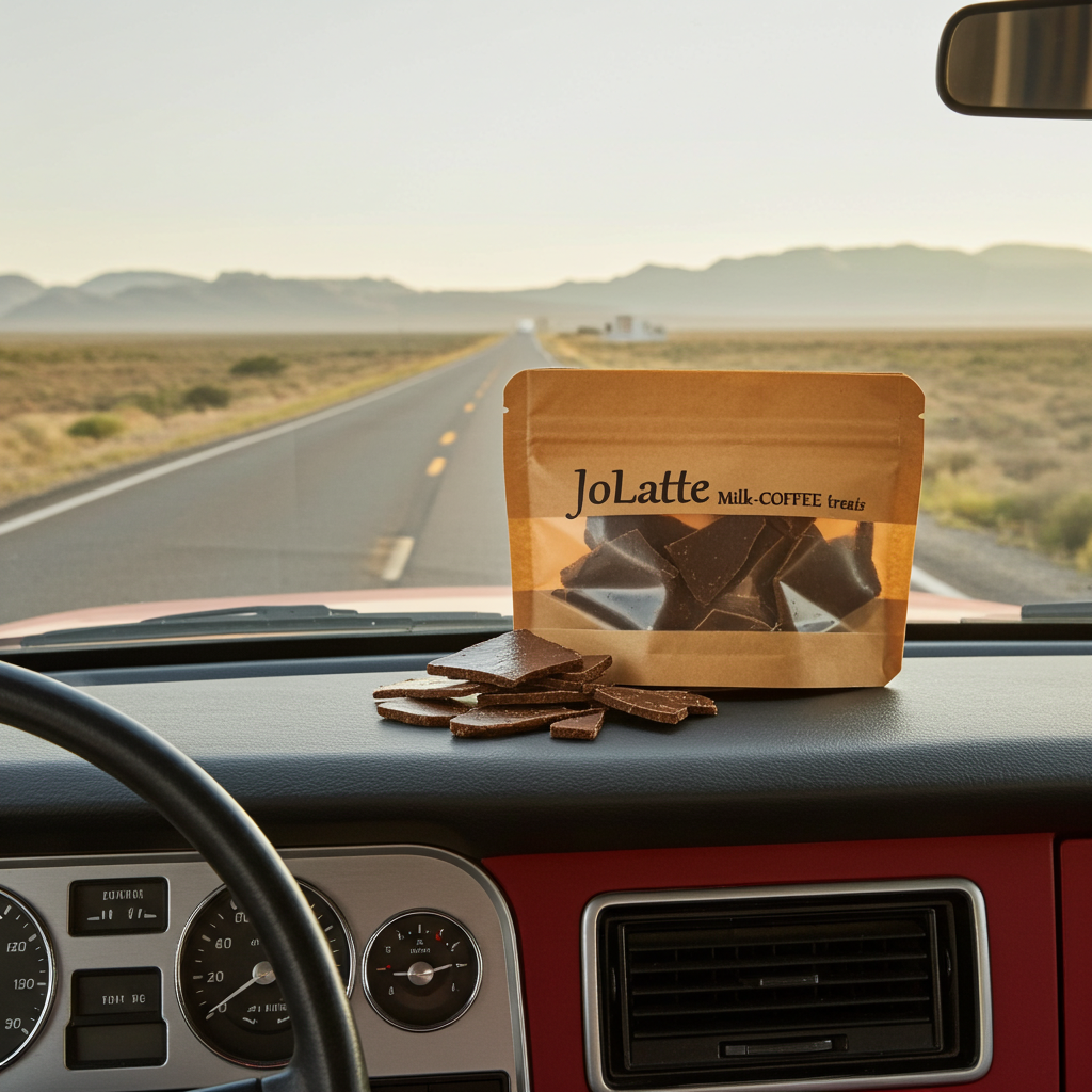 Discover "JoLatte" Milk-Coffee treats - an innovative confection that puts delicious coffee right at your fingertips! Enjoy a delightful latte snacking experience as soon as the desire strikes rather than finding a line to stand in somewhere. These unique treats feature a bold, rich, real espresso/coffee taste crafted from just four natural ingredients, offering the perfect balance of light sweetness and bold latte flavor in solid form. If energy is your aim then gear up! JoLatte contains 200-300mg caffeine (typically 250mg) from real coffee beans and their natural caffeine content. This rivals your favorite coffee, espresso and energy drinks. Each piece comes in an appealing dark brown "bark" style shape, making them perfect for sharing or enjoying throughout the day. The texture is somewhere between chocolate and fudge. Smooth overall but with a slight coffee bean grit. The treats are conveniently packaged in 1.5oz resealable craft paper style pouches that maintain freshness and make them ideal for on-the-go snacking. Despite their chocolate-like appearance, these treats contain no actual chocolate. JoLatte isn't even trying to imitate or substitute for chocolate making it a distincti alternative for coffee lovers seeking a novel way to enjoy their favorite beverage flavor. Whether you're looking for an afternoon pick-me-up or a unique real coffee treat, JoLatte offers a satisfying solution that bridges the gap between your morning latte and portable snack food.
